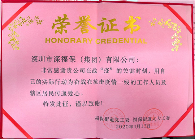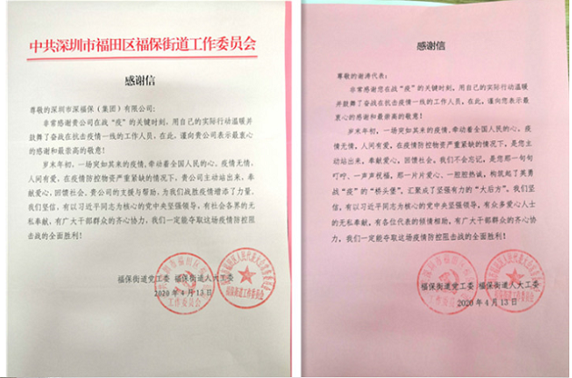 近日,福保街道党工委、福保街道人大工委向集团颁发了抗疫荣誉证书和感谢信,表彰和感谢乐鱼leyu集团及福田区人大代表、集团党委书记董事长谢涛在抗疫期间对辖区一线抗疫工作的支持和配合。市公安局交通警察局向物业公司颁发了《同舟共济以爱筑城》荣誉证书,感谢物业公司在抗疫期间对交警工作的关心与支持。