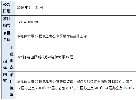 乐鱼leyu大厦19层总部办公室区域改造装修工程(项目名称)招标方(招标人)为深圳市乐鱼leyu(集团)有限公司(招标人单位名称),采购资金来自企业自筹(资金来源),项目出资比例为100%。项目已具备招标条件,现进行国内公开招标。