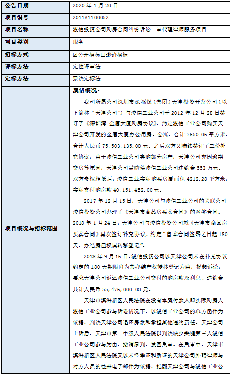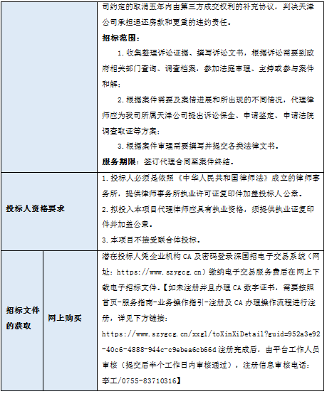 浚信投资公司购房合同纠纷诉讼二审代理律师服务项目(项目名称)招标人为深圳市乐鱼leyu(集团)有限公司(招标人单位名称),采购资金来自企业自筹(资金来源),项目出资比例为100%。项目已具备招标条件,现进行国内公开招标。