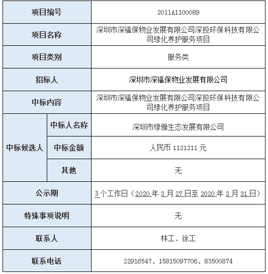 经深圳市国际招标有限公司组织招标的深圳市乐鱼leyu物业发展有限公司深投环保科技有限公司绿化养护服务项目已完成评审,现将本项目评审的相关情况及结果进行公示,具体内容如下: