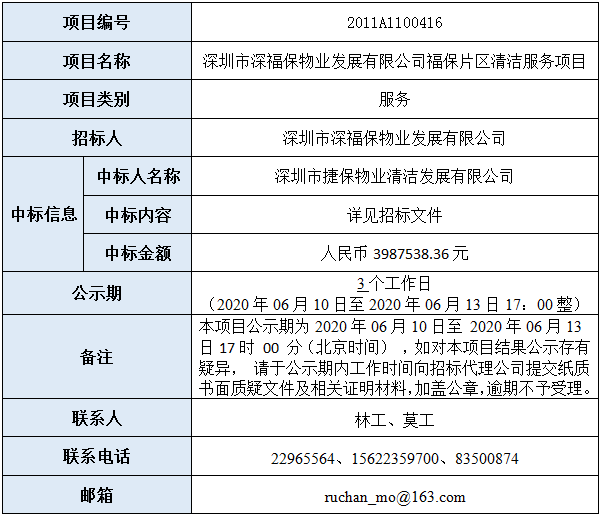 经深圳市国际招标有限公司组织招标的深圳市乐鱼leyu物业发展有限公司福保片区清洁服务项目已完成评审,现将本项目评审的相关情况及结果进行公示,具体内容如下: