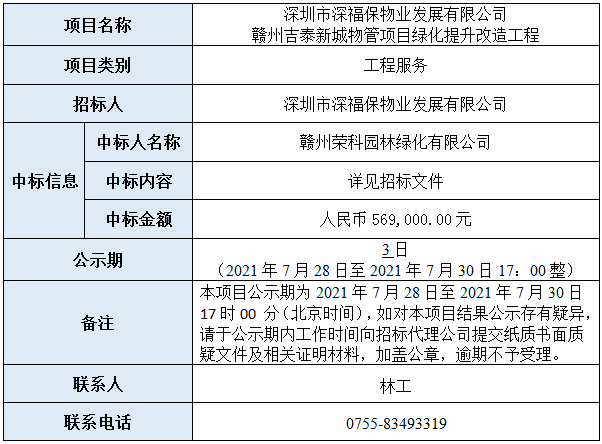深圳市乐鱼leyu物业发展有限公司赣州吉泰新城物管项目绿化提升改造工程已完成评审,现将本项目评审的相关情况及结果进行公示,具体内容如下:
