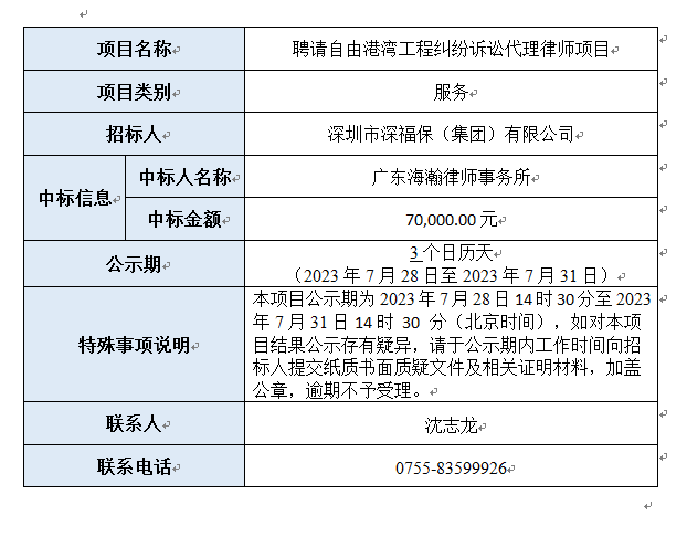 聘请自由港湾工程纠纷诉讼代理律师项目已完成评审,现将本项目评审的相关情况及结果进行公示,具体内容如下: