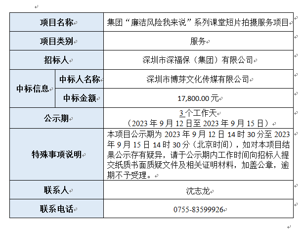 集团“廉洁风险我来说”系列课堂短片拍摄服务项目已完成评审,现将本项目评审的相关情况及结果进行公示,具体内容如下: