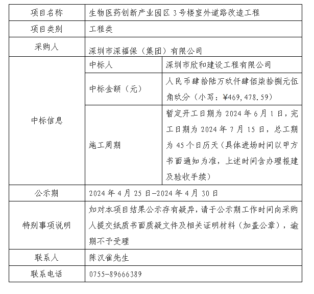 在深圳阳光采购平台进行公开招标的生物医药创新产业园区3号楼室外道路改造工程已完成评审及定标,现将本项目评审的相关情况及中标结果进行公示,具体内容如下: