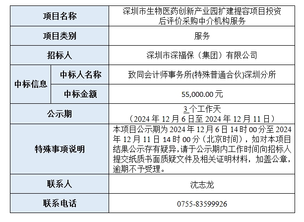 深圳市生物医药创新产业园扩建提容项目投资后评价采购中介机构服务已完成评审,现将本项目评审的相关情况及结果进行公示,具体内容如下: