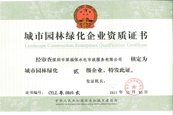 近日,广东省住房和城乡建设厅批准水电公司为城市园林绿化二级资质企业,这对水电公司参与政府城市园林绿化采购项目的投标将发挥重要作用,标志着水电公司市场竞争能力的提升。